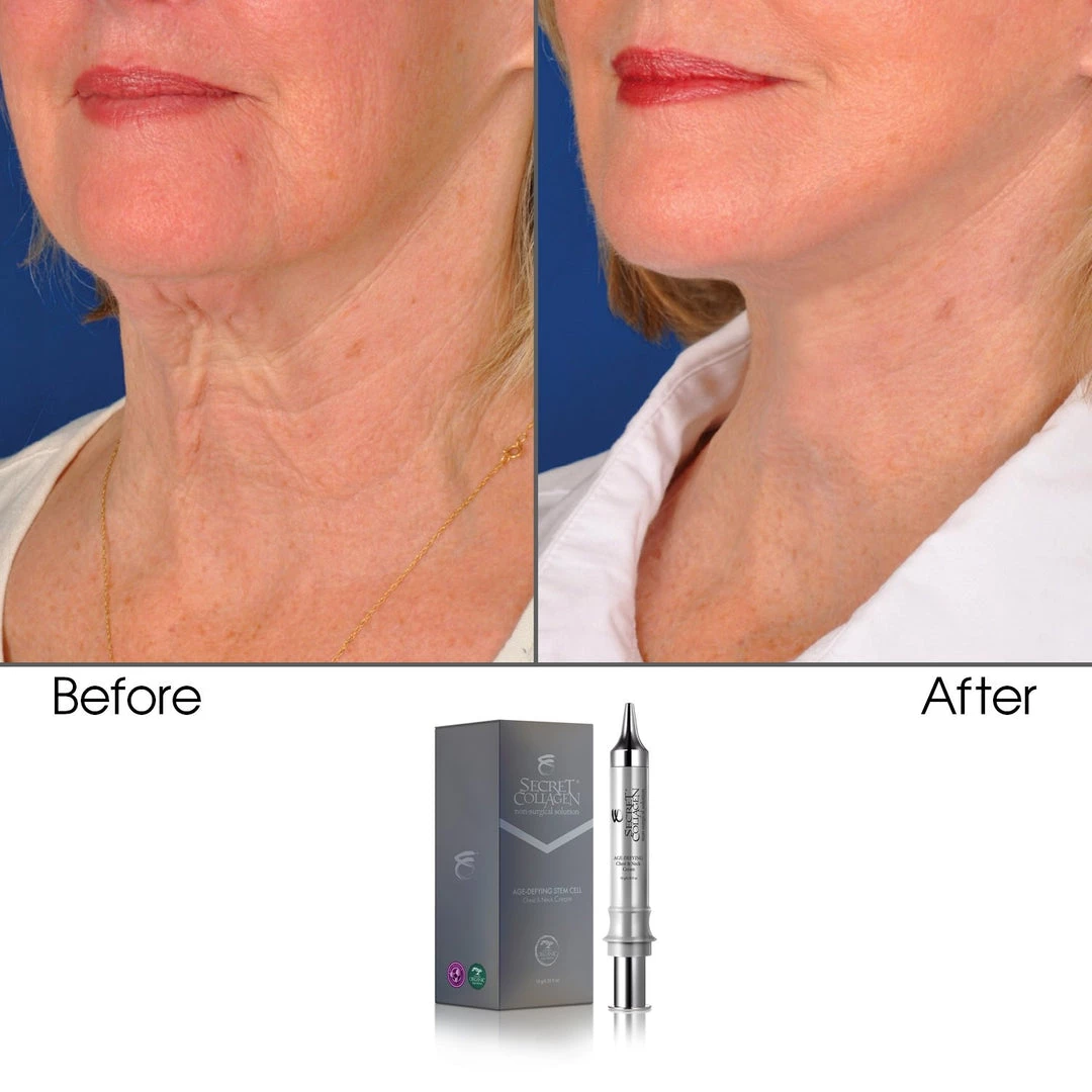 Cleanse the neck and chest area. Apply a nickel-sized amount of our Age-Defying Chest and Neck Cream in gentle, upward strokes. Massage cream in until completely absorbed.