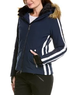 - Chloe Jacket In Navy With Stand-Up Collar, Removable Hood, Detachable Faux Fur Trim, Two Zippered Front Pockets, Inner Cuffs, Thumbholes, And Zippered Pocket At Left Sleeve