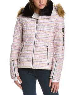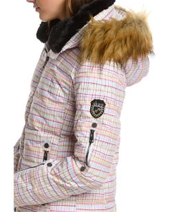 - Darcy Down Jacket In Check Fresh With Barrel Quilted Puffer Design, Stand-Up Collar, Hooded Back, Removable Faux Fur Trim, Zippered Cuffs, Inner Cuffs, Inner Snowskirt, And Two Zippered Front Pockets