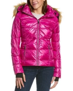 - Elsa Down Jacket In Orchid With Stand-Up Collar, Hooded Back, Removable Fur Trim, Two Zippered Front Pockets, Zippered Cuffs, Inner Snow Skirt, And Interior Pocket