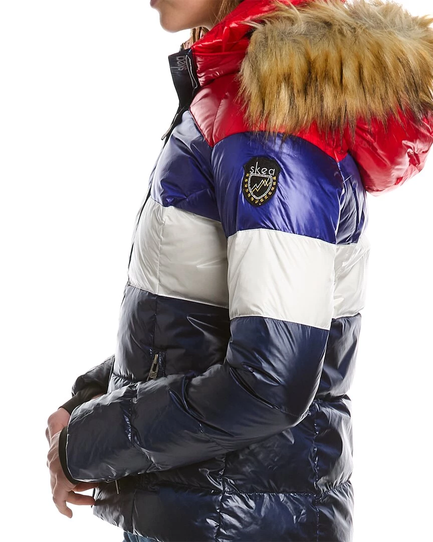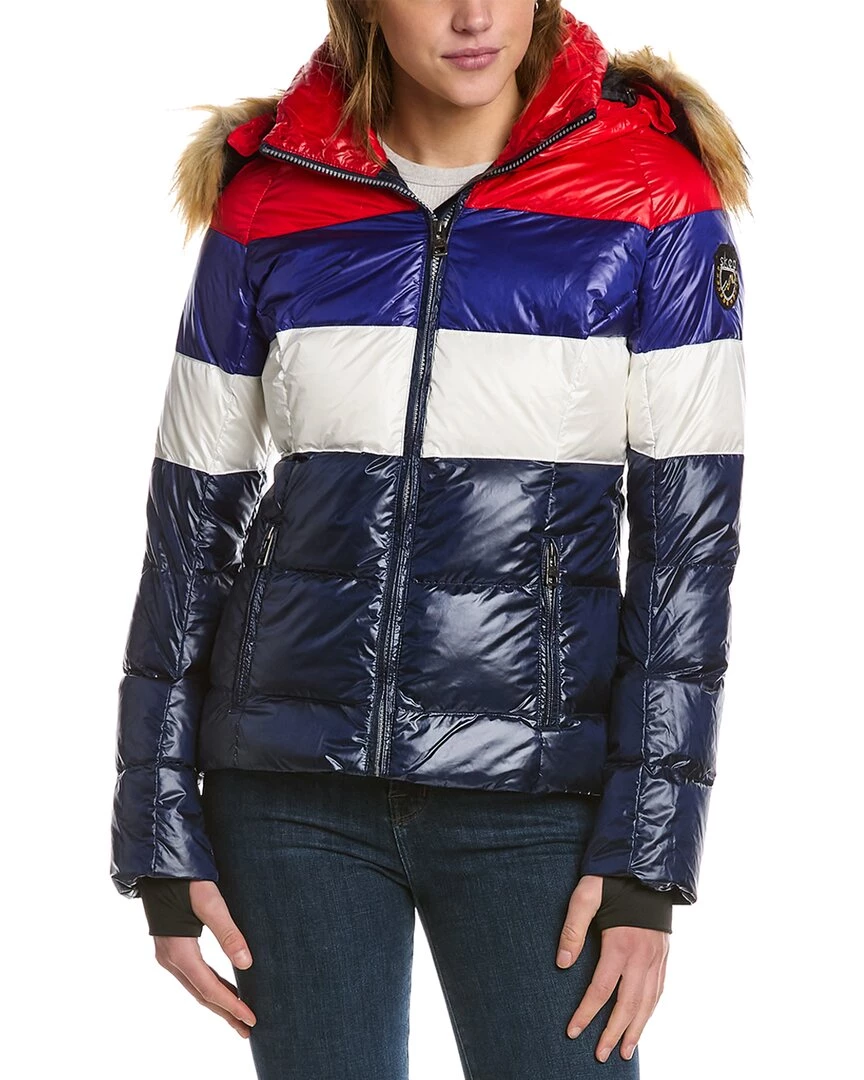 - Elsa Stripe Down Jacket In Navy Multicolor With Stand-Up Collar, Hooded Back, Removable Fur Trim, Two Zippered Front Pockets, Zippered Cuffs, Inner Snow Skirt, And Interior Pocket