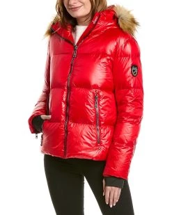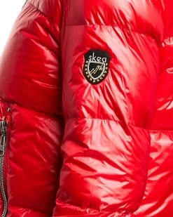 - Janus Down Jacket In Red With Barrel Quilted Puffer Design, Hooded Back, Removable Faux Fur Trim, Zippered Cuffs, Inner Cuffs, Inner Snowskirt, And Two Zippered Front Pockets