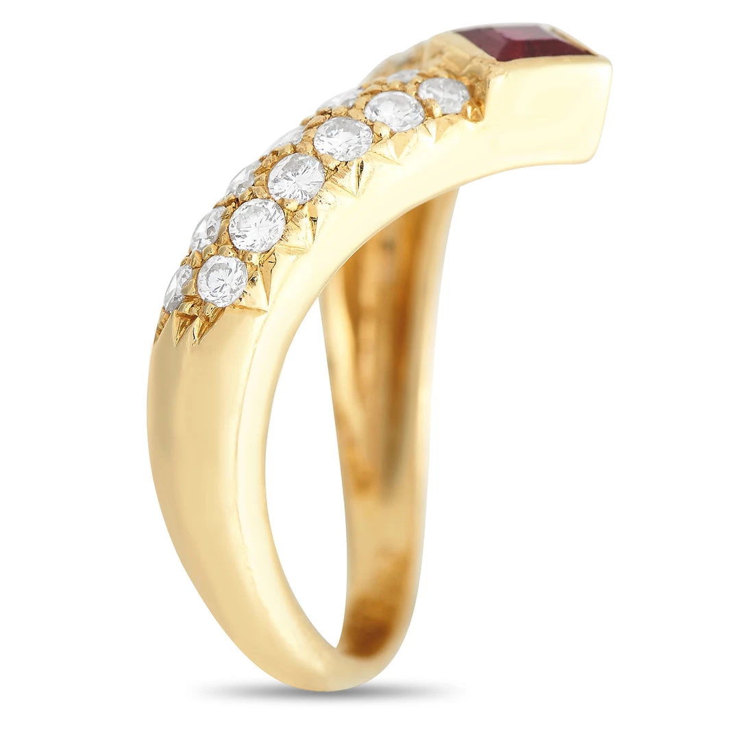 A uniquely curved setting made from 18K Yellow Gold makes this ring from Van Cleef & Arpels incredibly elegant. Sleek and dynamic in design, the 2mm wide band is adorned with 0.50 carats of diamonds with E color and VVS clarity. A single ruby accents the center of this striking accessory, which features a 4mm top height. This jewelry piece is offered in estate condition and includes a gift box.