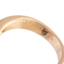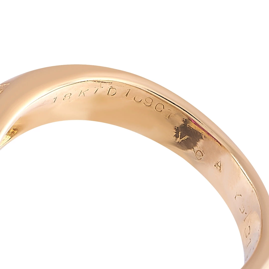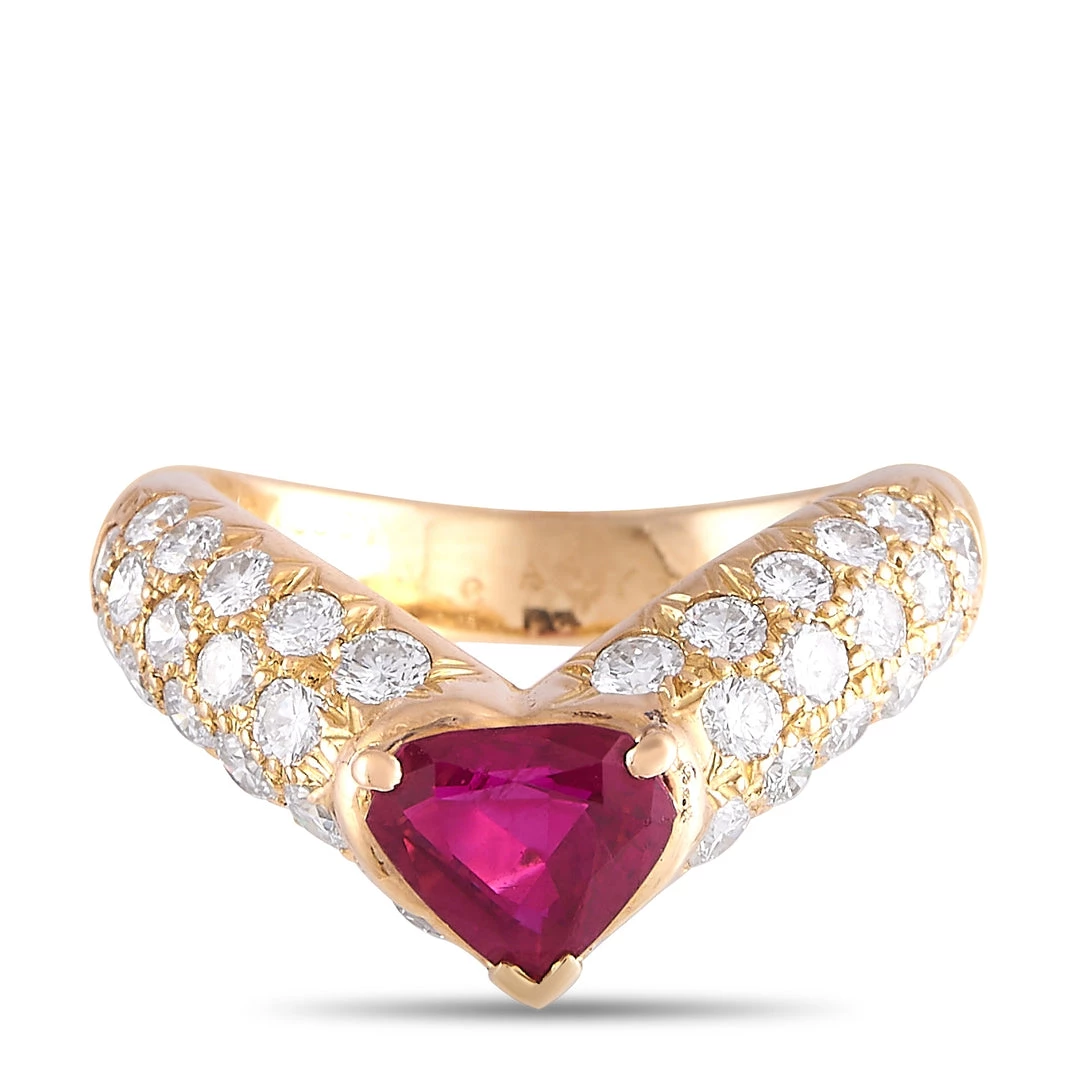 This ring from Van Cleef & Arpels exudes the brand’s classic sense of luxury. This V-shaped ring’s stylish 18K yellow gold setting is elevated by the presence of a 1.17 carat ruby center stone as well as glittering diamonds totaling 1.09 carats. This piece features a 5mm wide band and a top height of 6mm. This jewelry piece is offered in estate condition and includes a gift box.