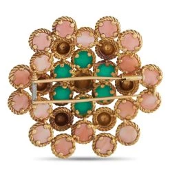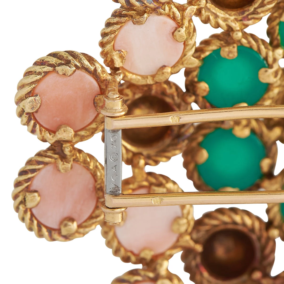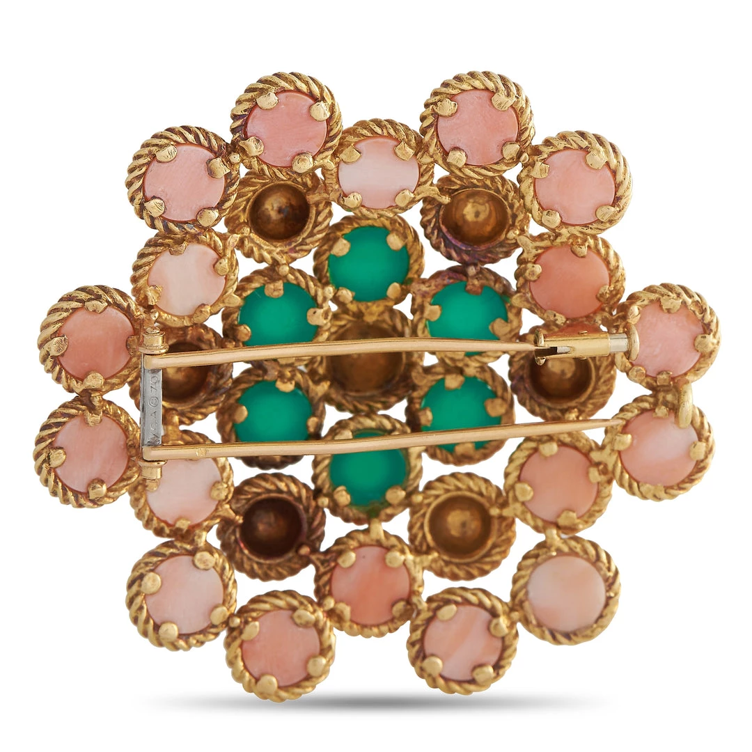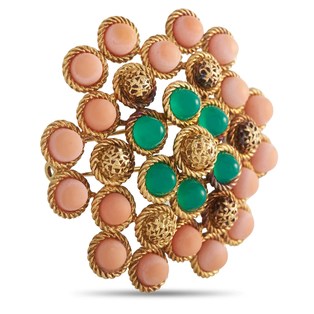 Bold colors and textures come together in perfect harmony on this luxurious vintage Van Cleef & Arpels brooch. Opulent 18K Yellow Gold metalwork provides the perfect foundation for this piece’s stunning arrangement of Coral and Chrysoprase cabochons. It measures 2.25” round and will continually capture your imagination. This jewelry piece is offered in estate condition and includes a gift pouch.